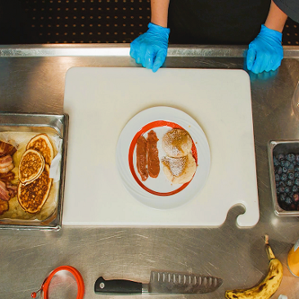 Prepare a pancake dish with bacon and syrup; Present food in a visually appealing way; Understand kitchen safety protocols